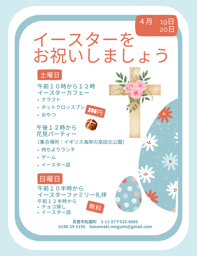 Easter is the celebration of Jesus’s resurection. If Jesus truly rose from the dead, anyone who believes in him can receive hope for life after death. Why don’t you come and celebrate with us this Easter at Hanamaki Grace Church?